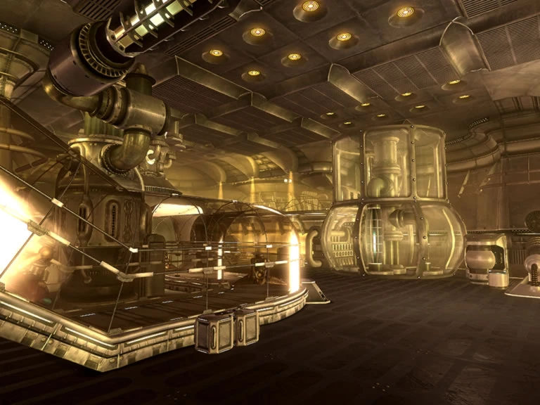 He then pushes aside what looks not unlike a cabinet door set into the wall, revealing a room beyond full of similarly red-clad members of his species. Several of them are working on this or that technological object, and one is tending to what might be some kind of chemistry set or similar, but the majority of them are hunched over instrument consoles not unlike the ones upstairs in the transporter room. The screens are circular and glow with a blue light that does the startled, furtive expressions on the other aliens' faces no good. Several of the nearer aliens shut their screens down immediately, in a fashion any office manager who has nearly caught a worker playing World of Warcraft would recognize.